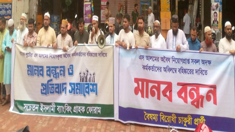 ইসলামী ব্যাংকে অবৈধ নিয়োগপ্রাপ্তদের বহিষ্কারের দাবিতে আশুলিয়ায় মানববন্ধন।...